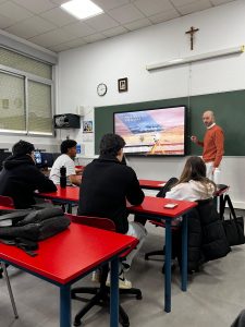 Nuestra primera parada fue el Colegio Salesianos Paseo de Extremadura (Madrid). Tuvimos la oportunidad de conocer al alumnado del Grado Superior en Proyectos de Obra Civil, un grupo motivado y con una gran curiosidad por el día a día del sector de la topografía.